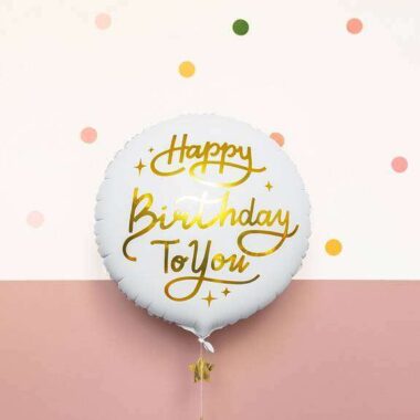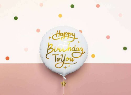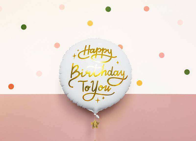 Gotowy, foliowy balon urodzinowy w kolorze białym, ze złotym napisem Happy Birthday to you.