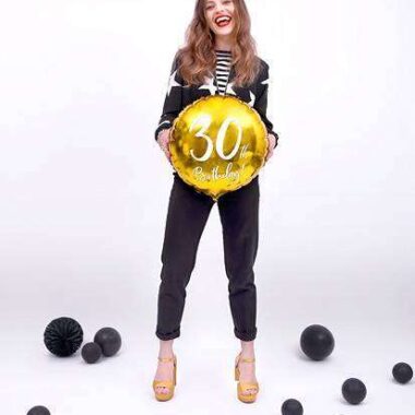 Okrągły balon na 30 urodziny w kolorze złotym.