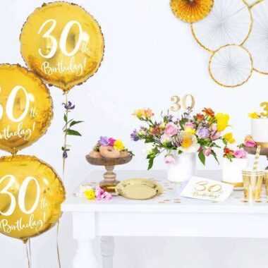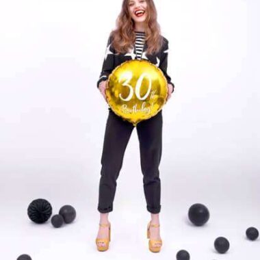 Złoty balon na 30 urodziny z białym napisem 30th Birthday, średnica ok. 45 cm. Trzydzieste urodziny to specjalna okazja na dobrą imprezę z super dekoracją.