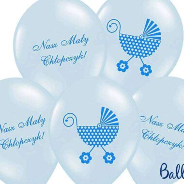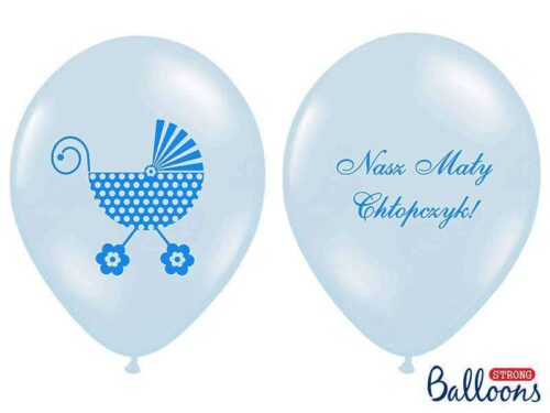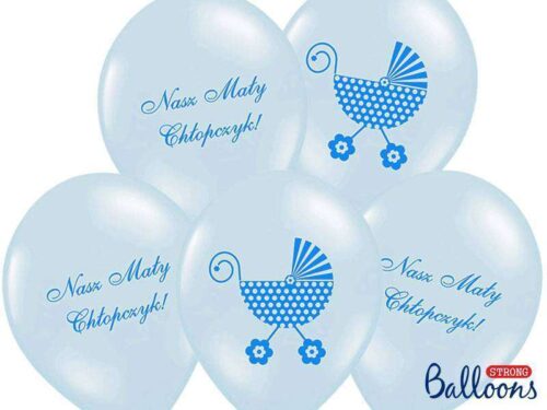 Lateksowy, niebieski balon z wózkiem i napisem Nasz mały chłopczyk. Rozmiar 30 cm.