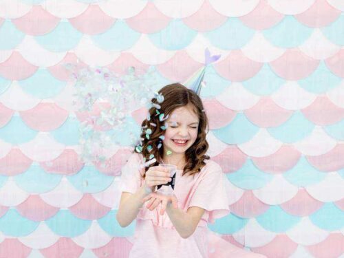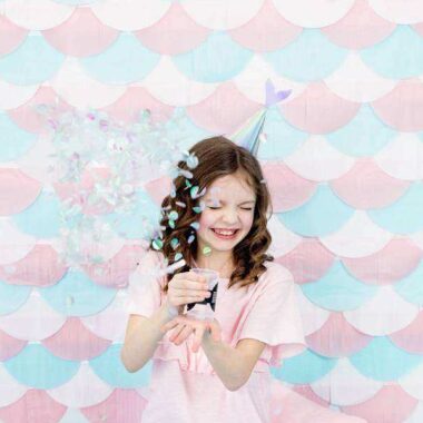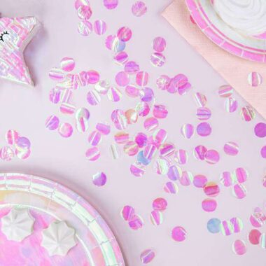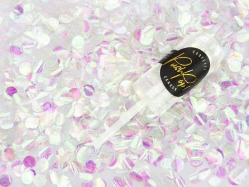 Push pop konfetti wykonane z folii w kolorze różowym opalizującym, średnica konfetti ok. 15 mm.