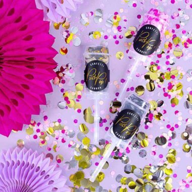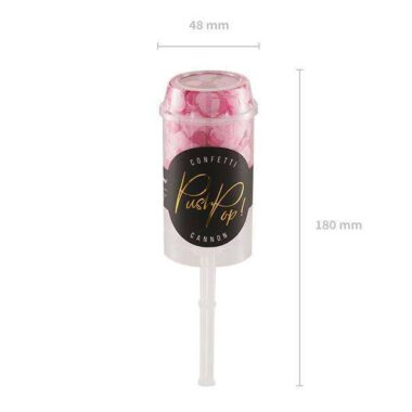 Push pop konfetti w kolorze jasnoróżowym i ciemnoróżowym, średnica konfetti ok. 8 mm.