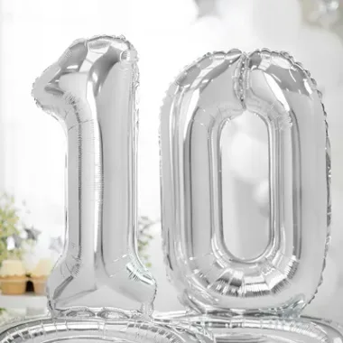 Metalizowany stojący balon foliowy Cyfra zero w kolorze srebrnym.